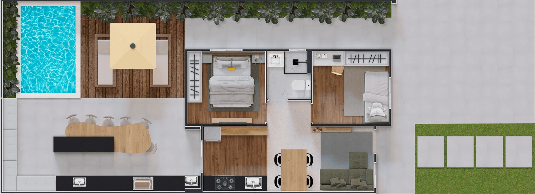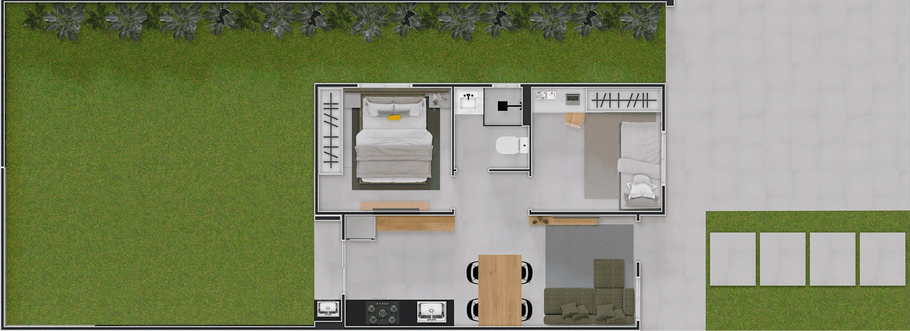 O Veccon Moradas Paulínia oferece plantas inteligentes e funcionais: Casas térreas com área construída de 42,67 m² Quintal privativo com espaço para área gourmet ou ampliação Projeto flexível com possibilidade de crescimento futuro Acabamentos